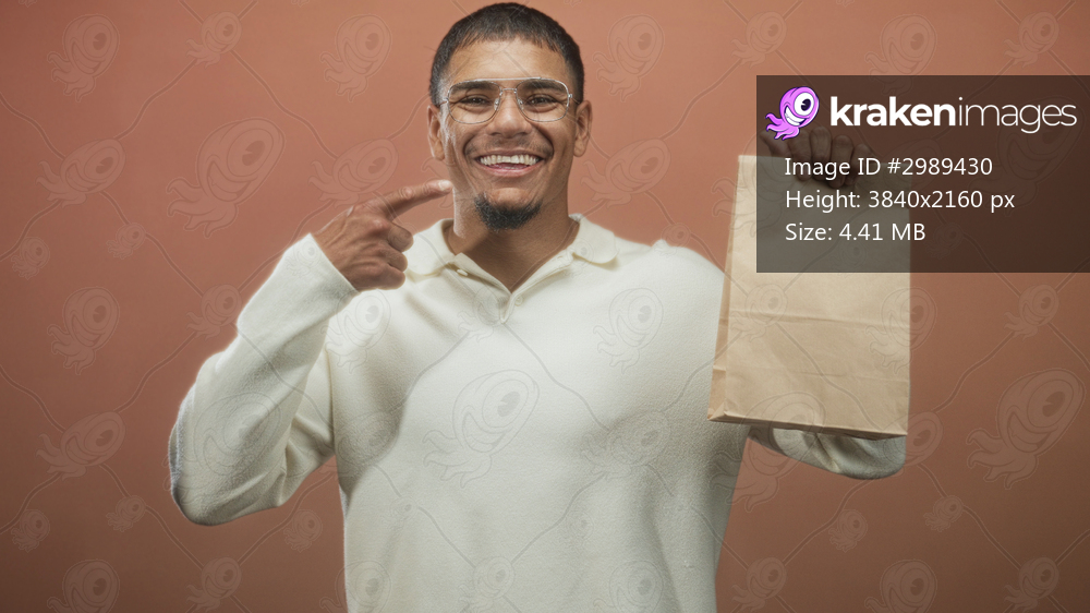 Young man holding a brown paper bag at chest level, pointing to the bag with one finger while smiling and wearing glasses and a white sweater in studio; happiness promotion. - Kraken Images