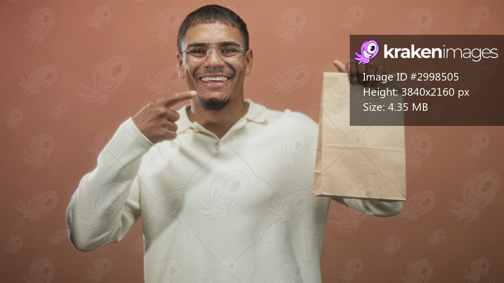Young man holding a brown paper bag at chest level, pointing to the bag with one finger while smiling and wearing glasses and a white sweater in studio; happiness promotion. - Kraken Images