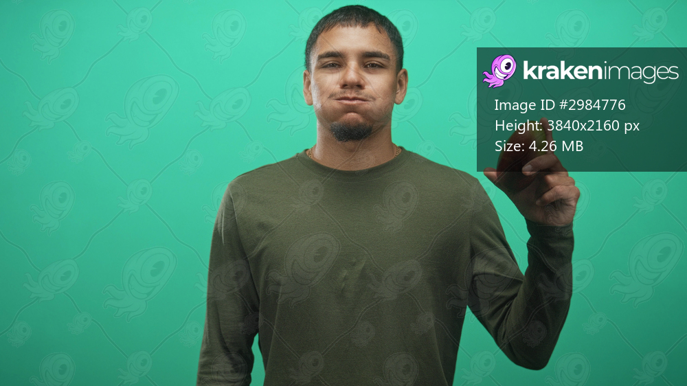 Young man holding a mango with raised hand and puffed cheeks while tasting the fruit in a green studio, presenting the mango; tropical joy.