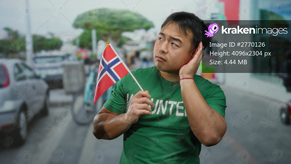 Young man holding a norwegian flag gestures listening on a busy urban street with blurred background, wearing a green volunteer shirt, embodying cultural exploration and engagement. - Kraken Images