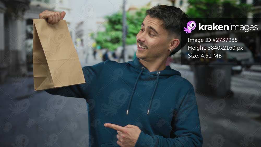 Young man holding a paper bag confidently on a bustling city street, showcasing casual city life with an urban background and pedestrians nearby.