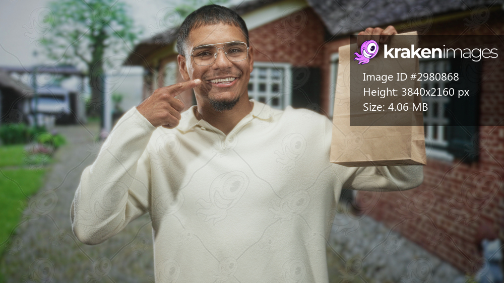Young man holding a paper bag and pointing to it on a street outside a brick house, smiling and offering the delivery; friendly service.