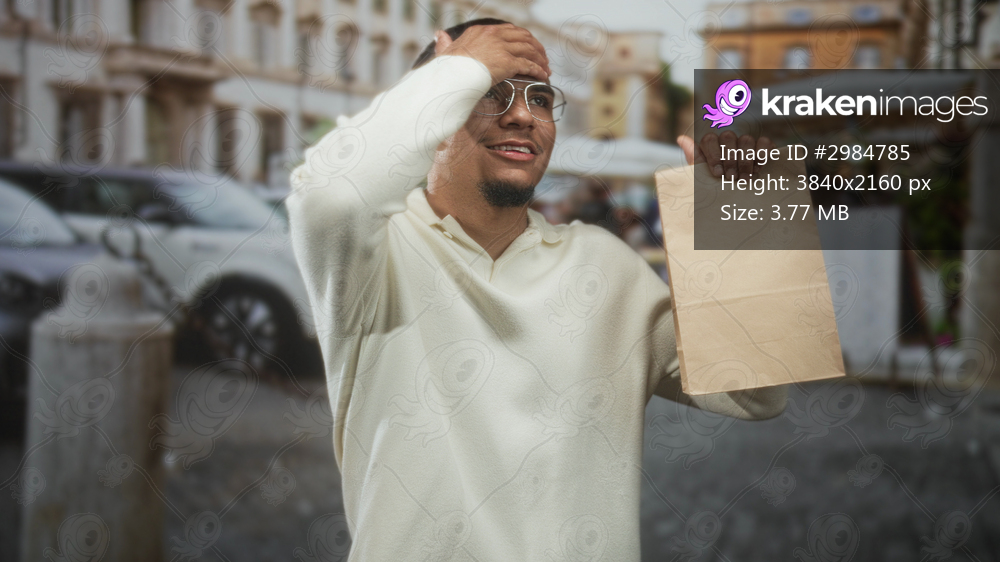 Young man holding a plain paper bag with hand on forehead on a cobblestone street, smiling and presenting the takeout item to passersby; relief takeaway. - Kraken Images
