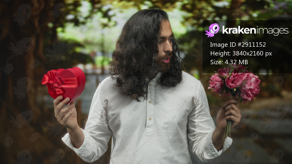 Young man holding a red heart box in one hand and a pink flower bouquet in the other, looking unsure between them on a forest park path; choice hesitation. - Kraken Images
