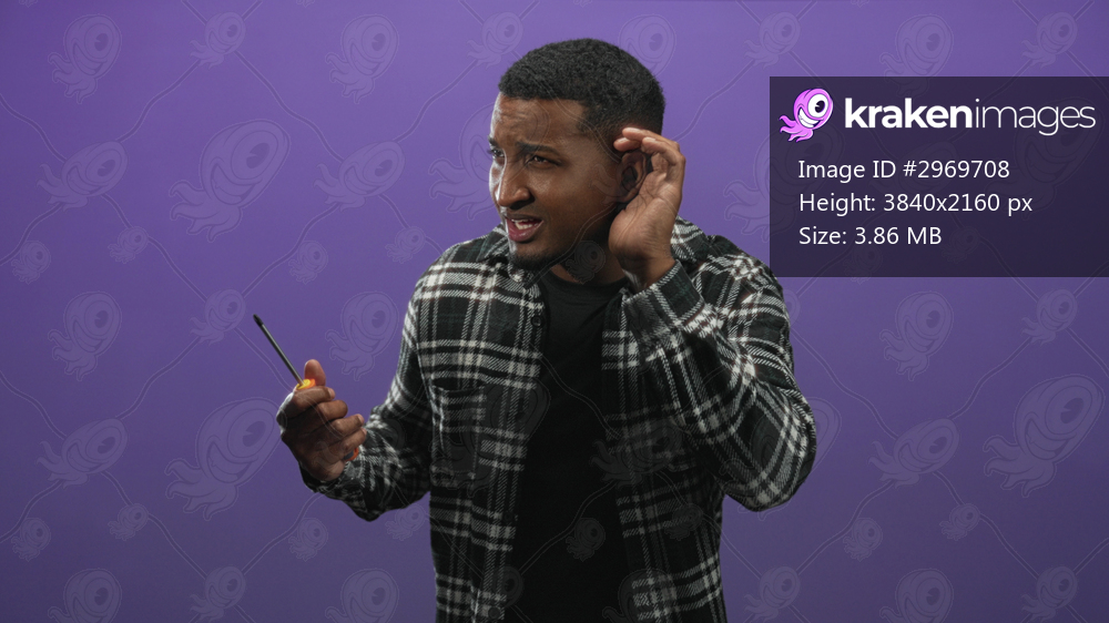 Young man holding a screwdriver, cupping his ear and tilting his head while listening in a studio with a purple backdrop; curiosity problem solving.