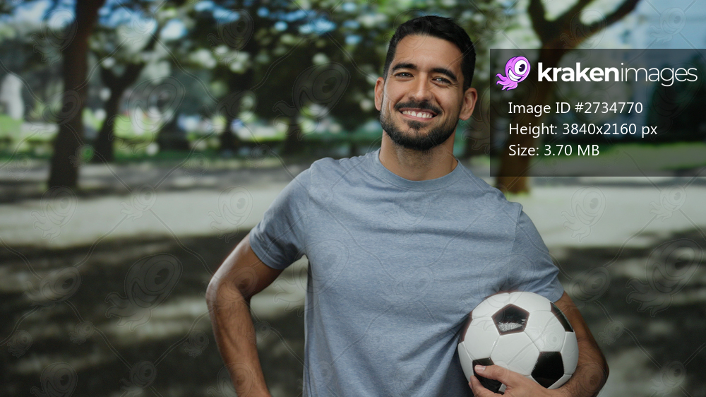 Young man holding a soccer ball smiles confidently in an urban park surrounded by trees, showcasing a relaxed athletic lifestyle in an outdoor setting. - Kraken Images