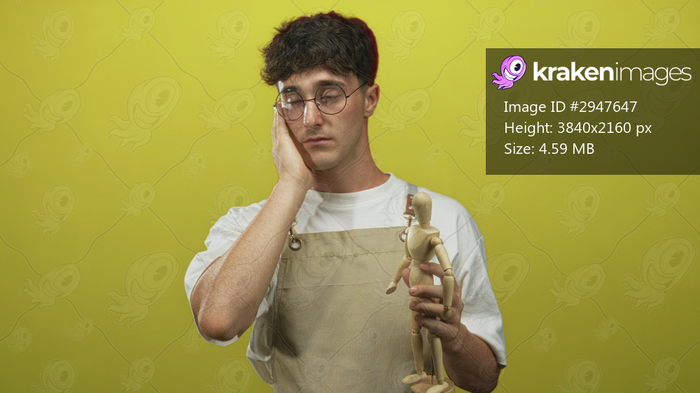 Young man holding a wooden mannequin and touching his cheek in a studio with a yellow green backdrop; introspection.