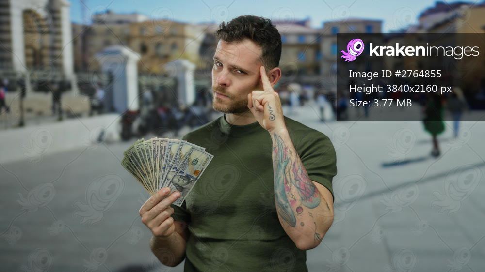 Young man holding american dollars on a busy urban street conveys thoughts of finance and decision-making in a vibrant city setting.