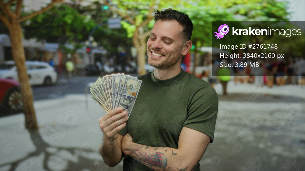 Young man holding american dollars on an urban street showcases united states banknotes in a sunny, outdoor city environment.