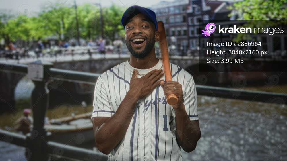 Young man holding baseball bat on shoulder on street by amsterdam canal with blue cap and striped jersey; confidence ambition.