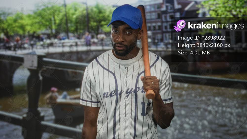 Young man holding baseball bat on shoulder on street by amsterdam canal with blue cap and striped jersey; confidence ambition.