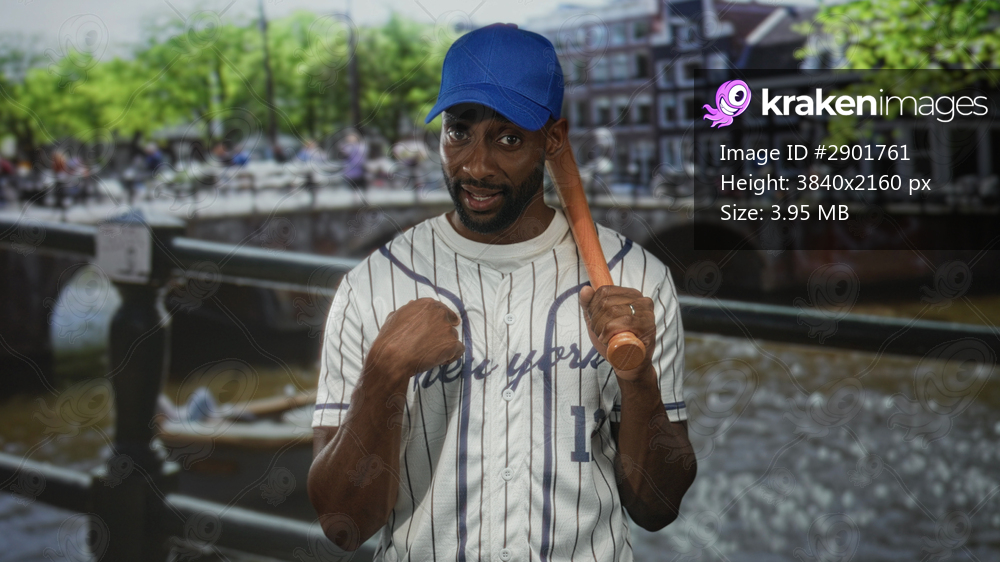 Young man holding baseball bat on shoulder on street by amsterdam canal with blue cap and striped jersey; confidence ambition.