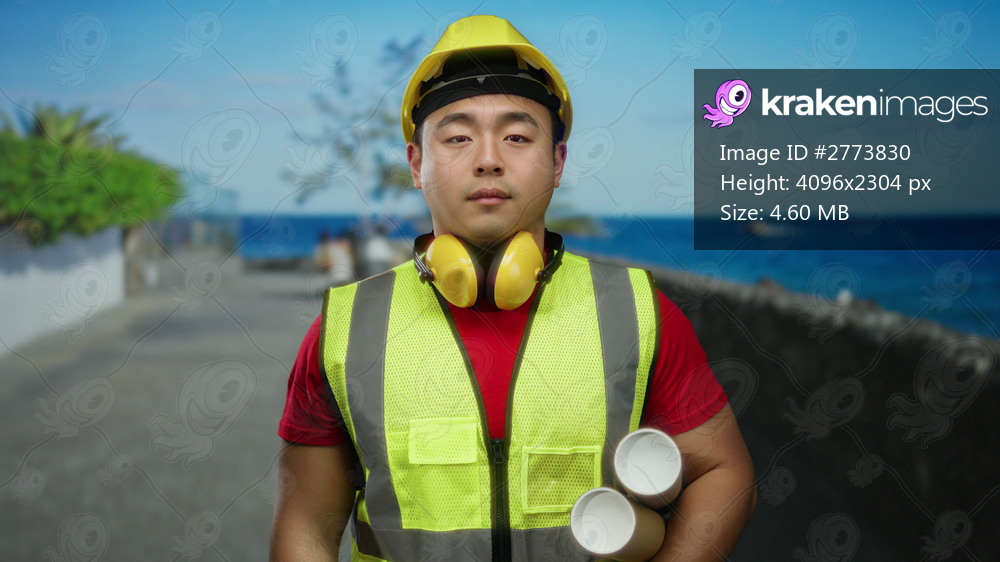 Young man holding blueprints wearing safety gear at seaside promenade with a calm sea background showcasing construction themes and architectural concepts outdoors. - Kraken Images