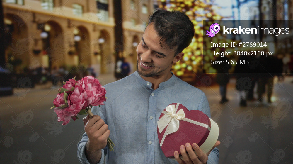 Young man holding bouquet and heart-shaped gift on city street with festive lights in background, smiling cheerfully.