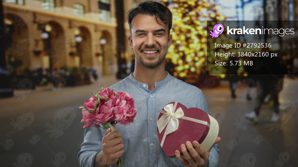 Young man holding bouquet and heart-shaped gift on city street with festive lights in background, smiling cheerfully.