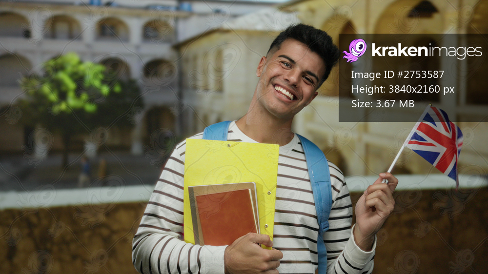 Young man holding british flag and folders in an old university courtyard setting, symbolizing education and international studies.
