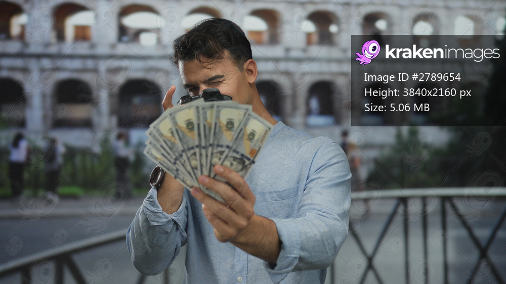 Young man holding camera and dollar banknotes at roman coliseum highlighting leisure travel finance and photography outdoors.