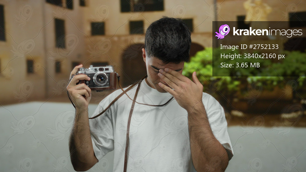 Young man holding camera outdoors in city street showing casual expression with historic architecture in background.