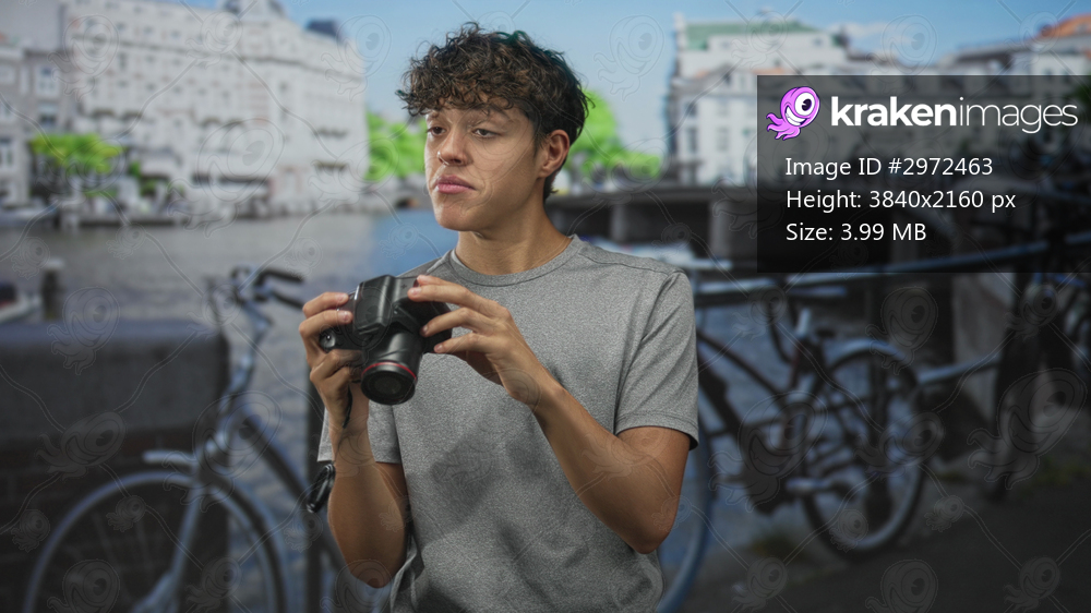 Young man holding dslr camera, hand to mouth gesture on a street beside canal and parked bicycles; surprise curiosity discovery.