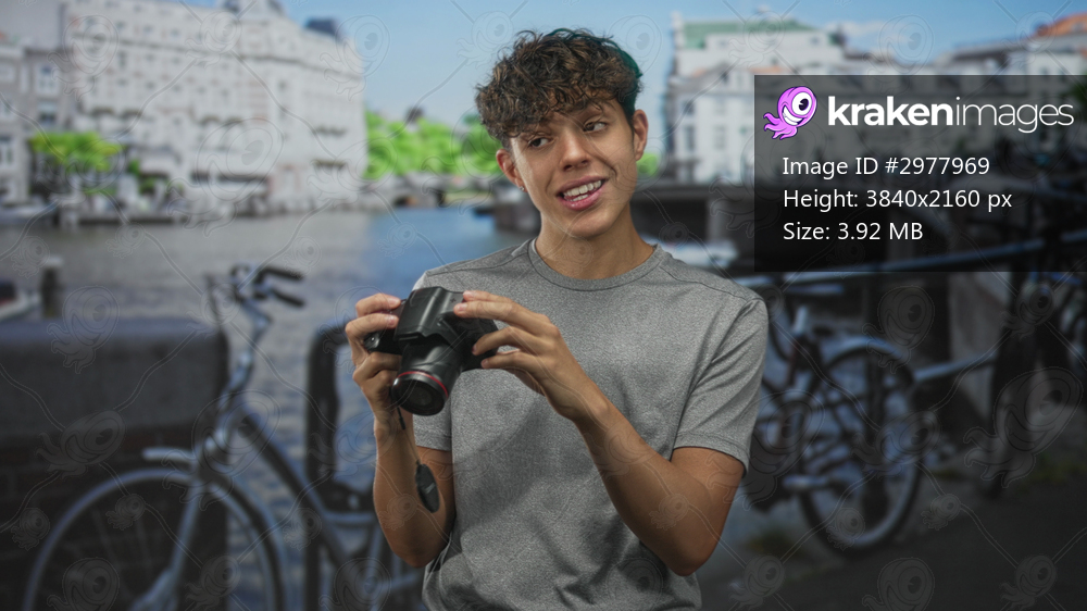 Young man holding dslr camera, hand to mouth gesture on a street beside canal and parked bicycles; surprise curiosity discovery.