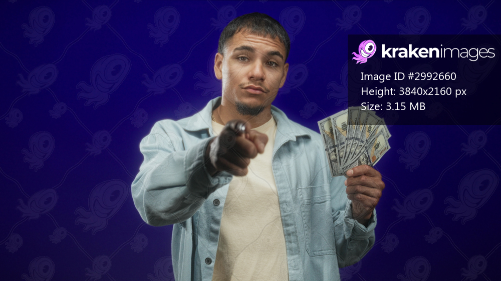 Young man holding fanned us dollars, pointing finger at camera and touching temple in studio; confidence ambition reward.