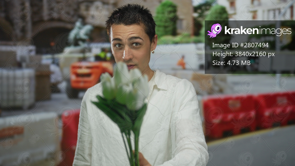 Young man holding flowers at an outdoor construction site offers a unique contrast between delicate blooms and urban equipment.