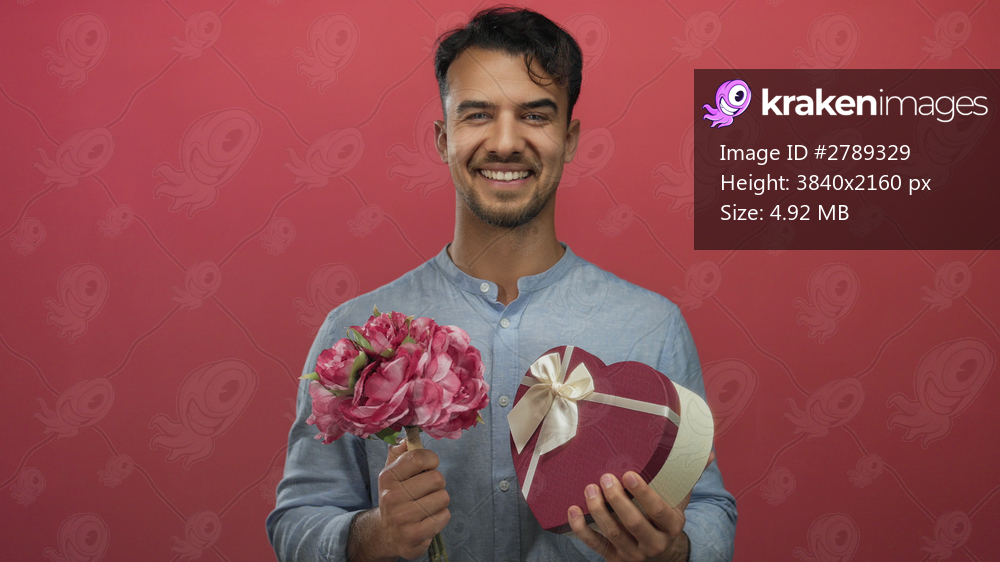 Young man holding flowers and gift box over red background showcasing romance and thoughtfulness