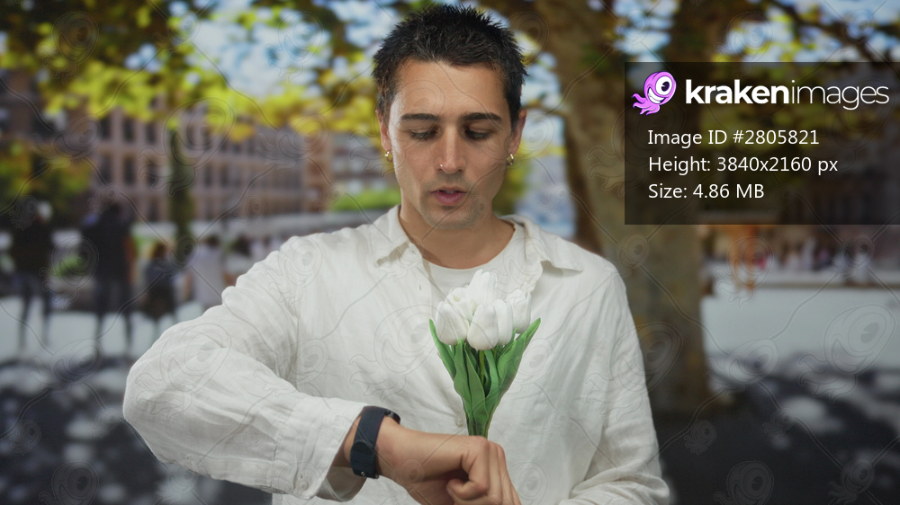 Young man holding flowers on a sunny urban street wearing white shirt focused on time checking smart watch surrounded by blurred outdoor city scene with trees and buildings. - Kraken Images