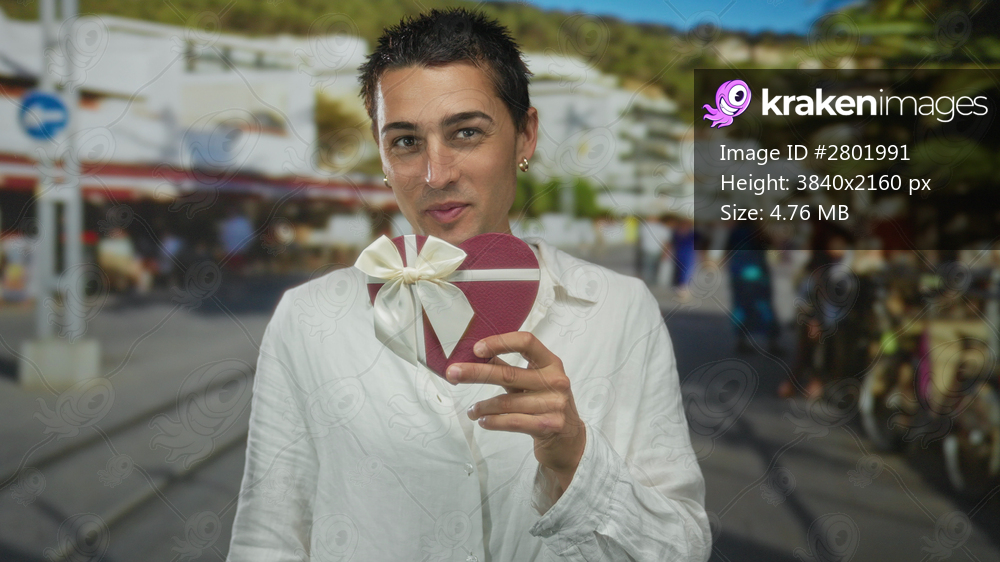 Young man holding gift box in urban street setting, smiling outdoors in vibrant cityscape with people walking in background.