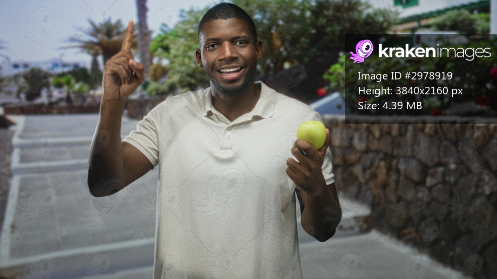 Young man holding green apple and pointing finger on street by stone wall and palm trees; confidence health.