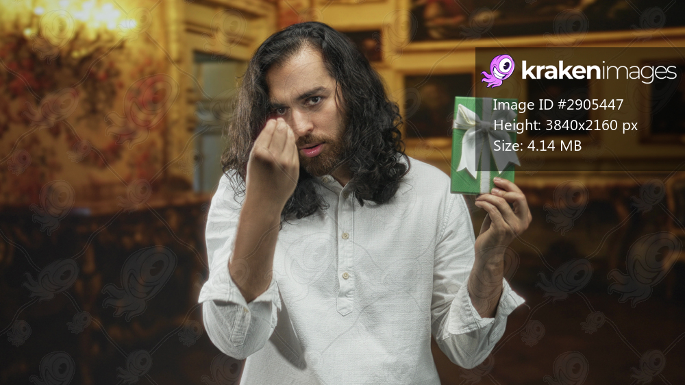 Young man holding green gift box and pinched fingers gesture in ornate museum building; offering gift curiosity.