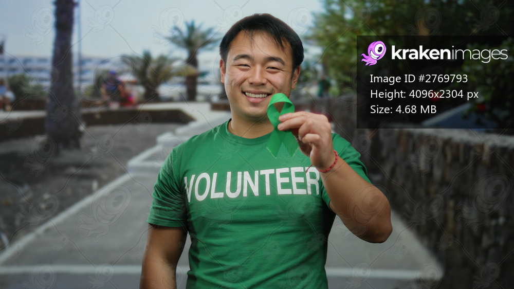 Young man holding green ribbon in urban street, wearing volunteer shirt, symbolizing support and community involvement outdoors in city environment, china. - Kraken Images