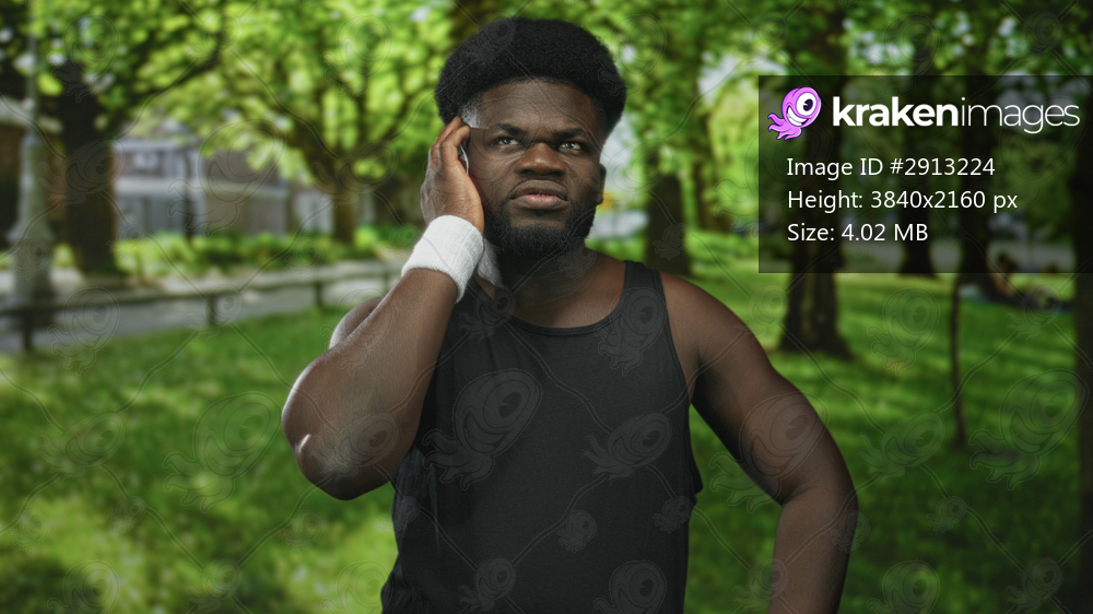 Young man holding hand to ear by city building in park with visible wristband and black tank top; listening annoyance.
