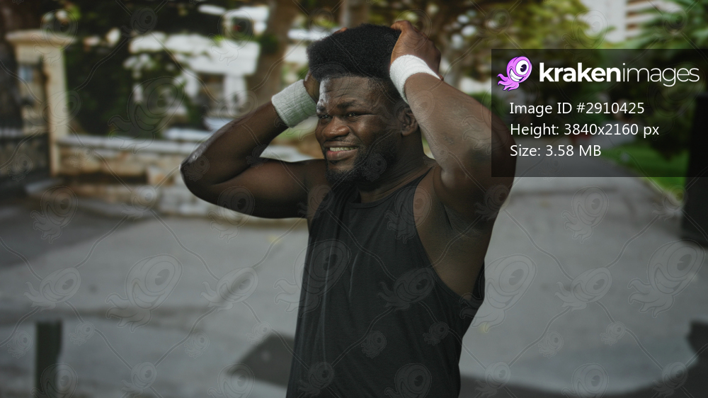 Young man holding hands on head and flexing biceps with a clenched fist on street; confidence strength.