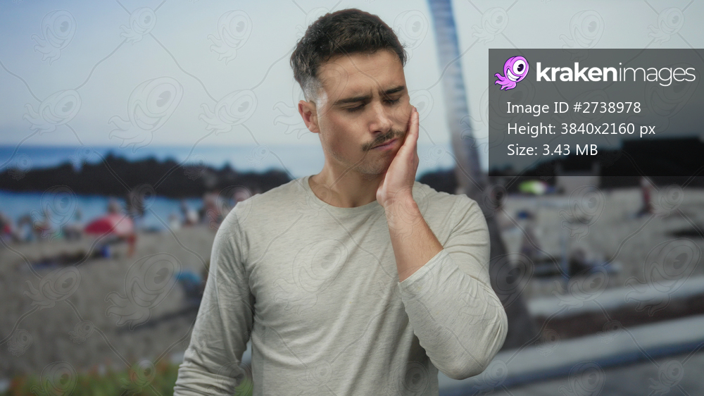 Young man holding his jaw in discomfort at a sunny beach with blue sea background and people relaxing on the seaside.