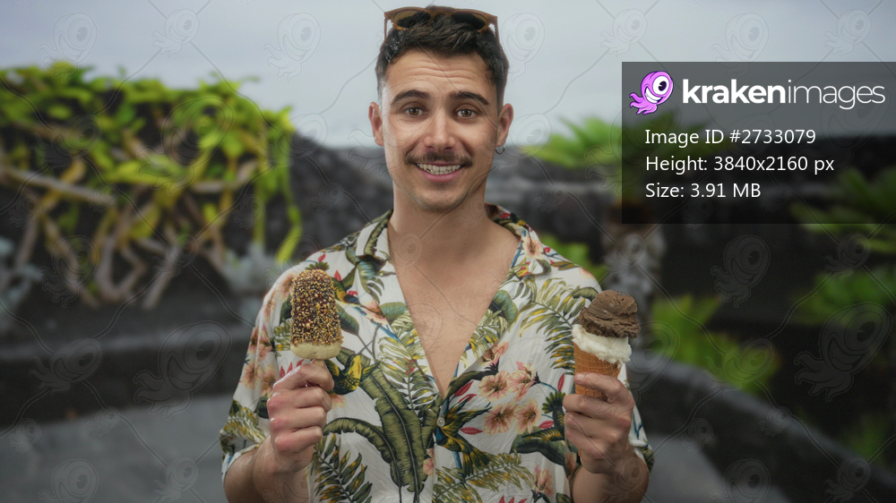 Young man holding ice cream cones in outdoor park setting wearing tropical shirt enjoying sunny day