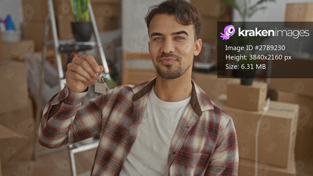Young man holding key and smiling in a new home setting with moving boxes and plants, representing a fresh start in an indoor apartment space.