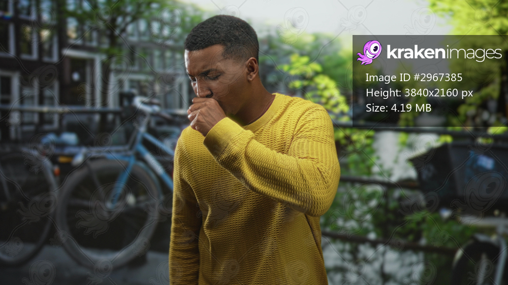 Young man holding lemon to mouth with hand, wearing yellow sweater on street by canal and bicycles; discomfort.