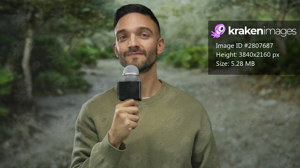 Young man holding microphone during interview in lush park setting, surrounded by greenery, showcasing casual attire and engaging in vibrant outdoor conversation. - Kraken Images