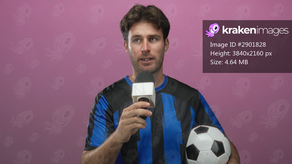 Young man holding microphone and soccer ball in studio with pink backdrop wearing blue and black jersey; enthusiasm team spirit.