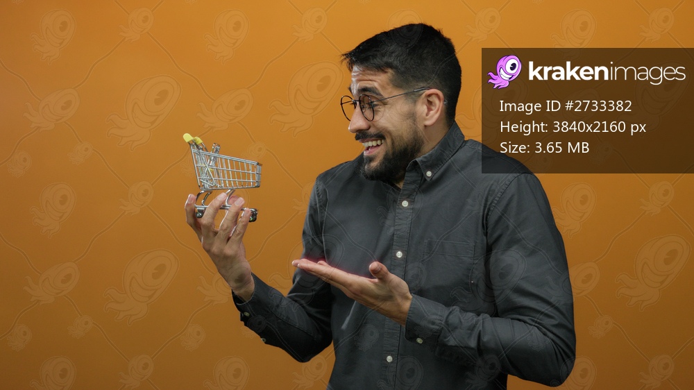 Young man holding miniature shopping cart against vibrant orange background, expressing mixed emotions, isolated and trendy in casual attire, emphasizing online shopping theme.