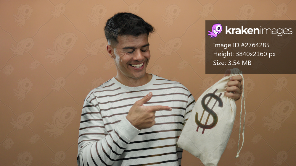 Young man holding money bag with dollar sign isolated against brown background smiling and showing gestures of happiness.