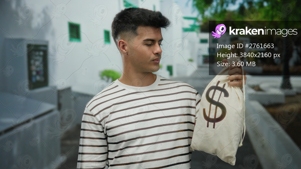 Young man holding money bag on city street, showcasing finance theme in an urban outdoor setting, highlighting modern lifestyle.