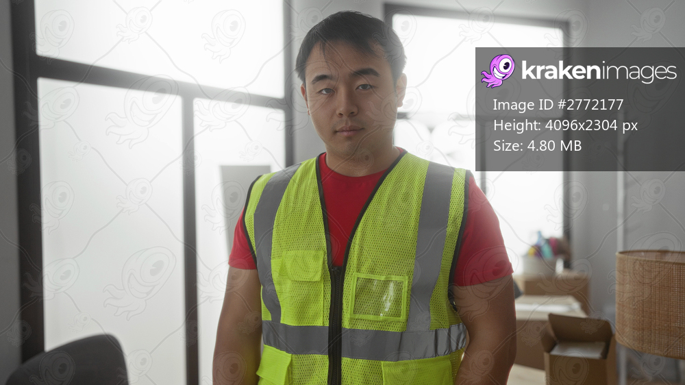 Young man holding money in new home interior wearing safety vest, showcasing happy expression amidst moving boxes, embodying success and construction themes. - Kraken Images