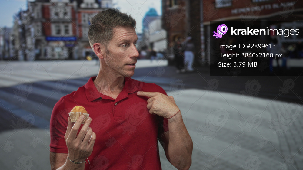 Young man holding muffin points finger to chest on city street wearing red polo and bracelets; doubt humor.