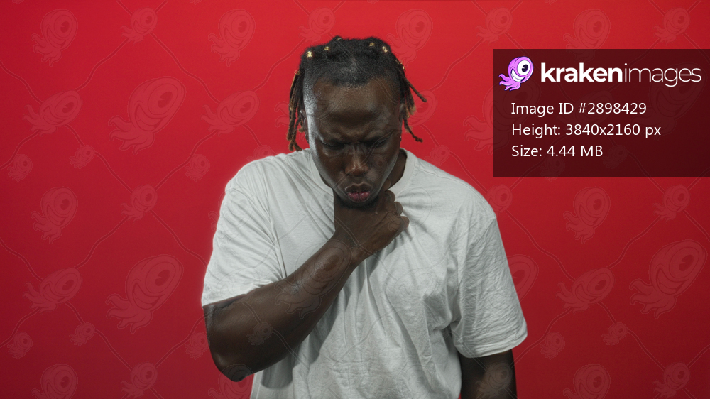 Young man holding neck with hand, grimacing and clutching throat in red studio wearing white t shirt; choking pain.