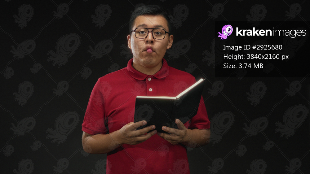 Young man holding open book with hands and reading aloud in black studio under soft light; curiosity learning focus.