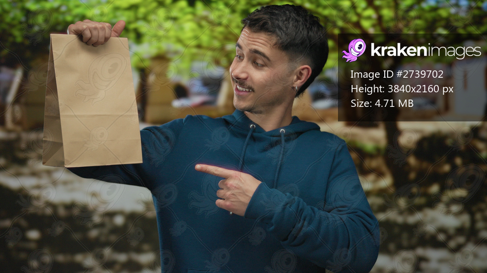 Young man holding paper bag in park with trees in background showing casual outdoor scene in natural daylight.