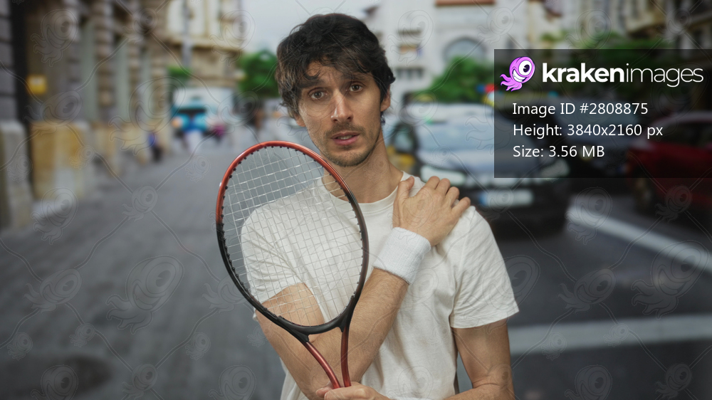 Young man holding red tennis racket touches shoulder on street amid blurred traffic and stone buildings; determination.