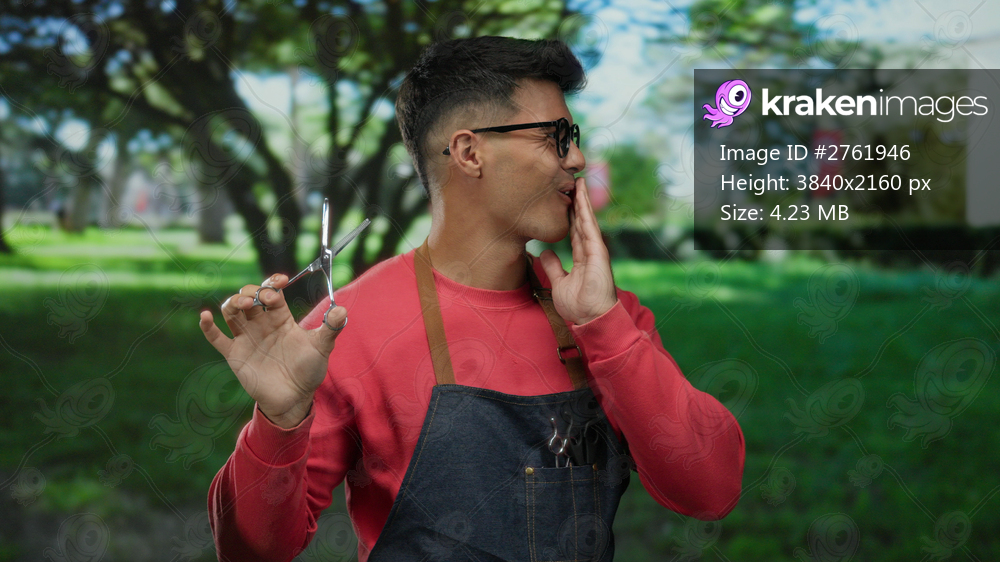 Young man holding scissors in a park setting, expressing playfully with glasses and apron, showcasing a stylish, outdoor, casual vibe with vibrant attire. - Kraken Images